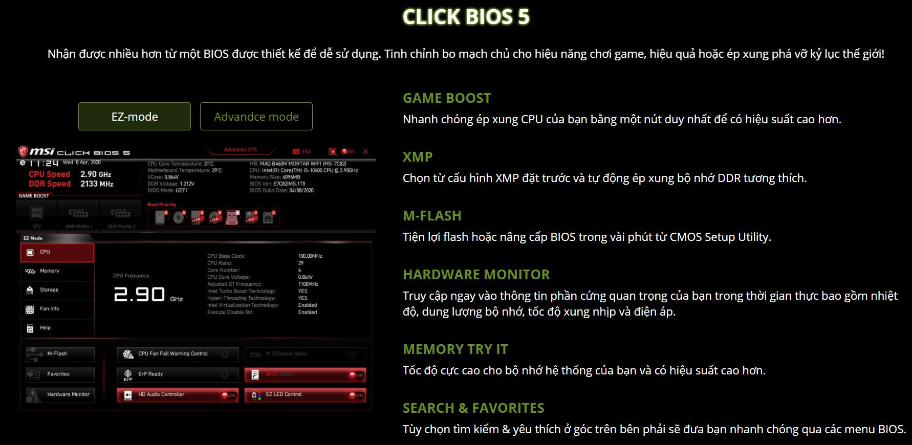 Click Bios thế hệ thứ 5 của MSI cung cấp cho người dùng một giao diện trực quan, dễ sử dụng nhưng cũng đồng thời tích hợp đầy đủ bất kỳ tính năng nào mà người dùng từ cơ bản đến nâng cao cần.