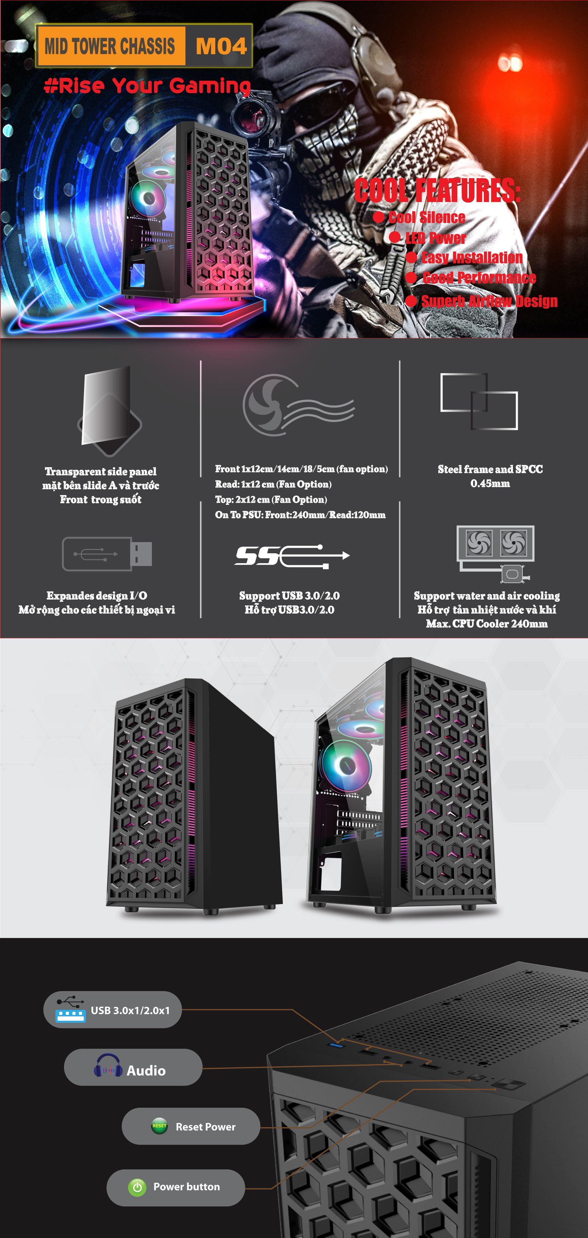 | Cooling/quạt tản nhiệt | Front 2x12cm/14cm/18/5cm (fan option) Read: 1x12 cm (Fan Option) Top: 2x12 cm (Fan Option) On To PSU: Front:240mm/Read:120mm |