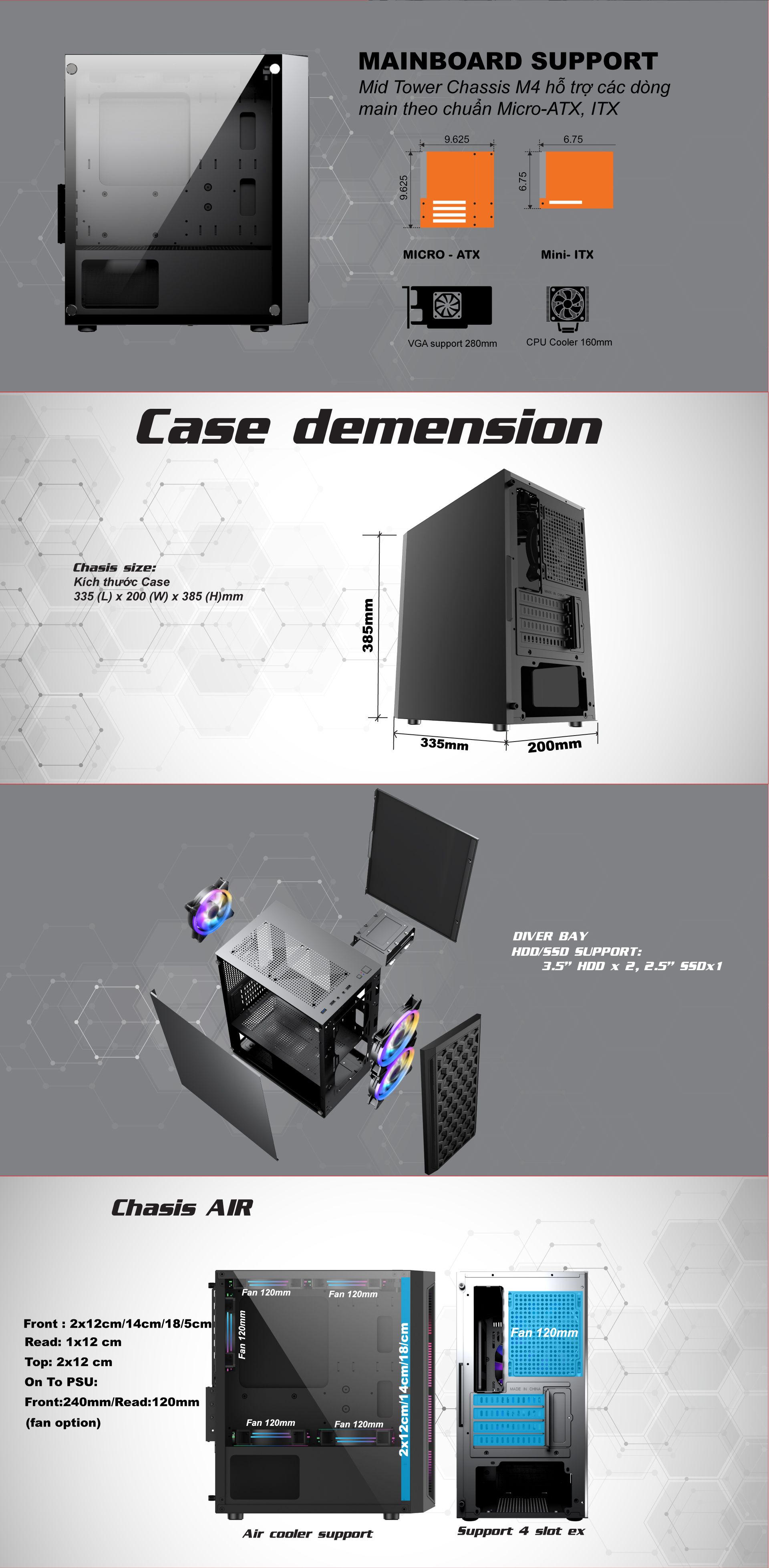 | Kích thước Case | 335 (L) x 200 (W) x 385 (H)mm |